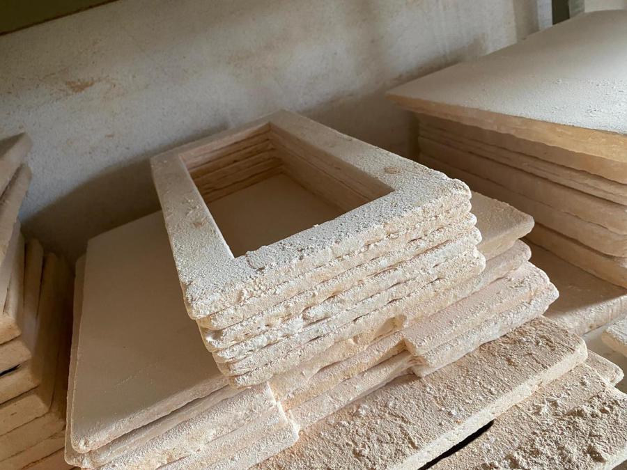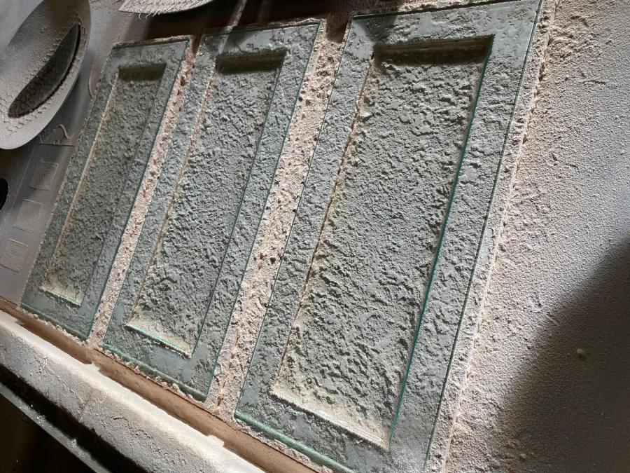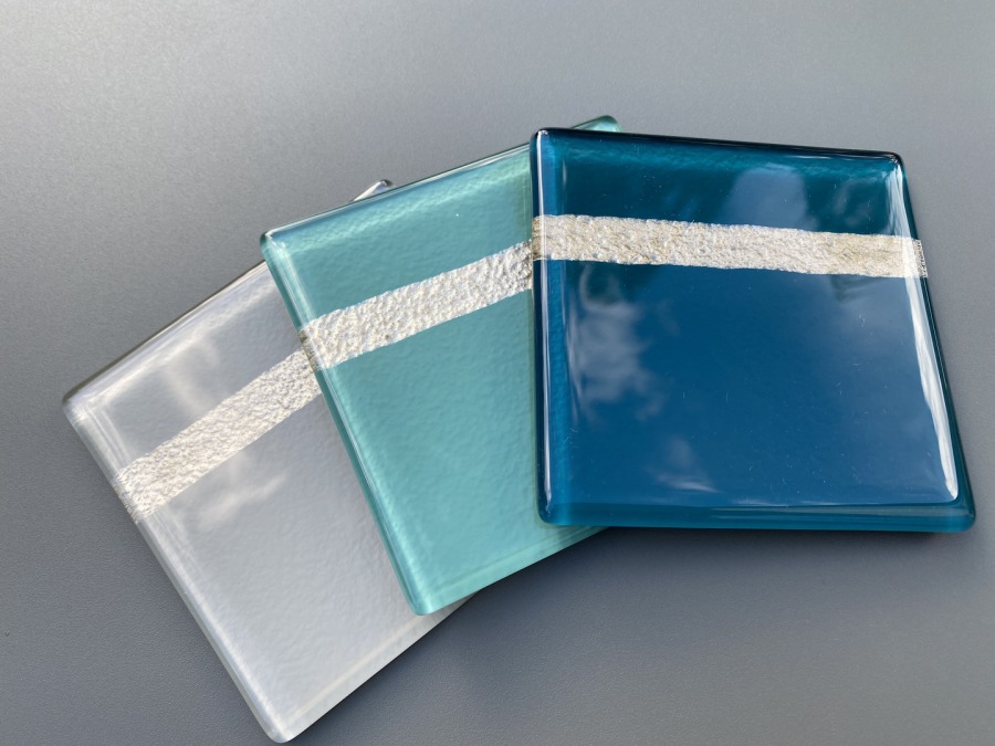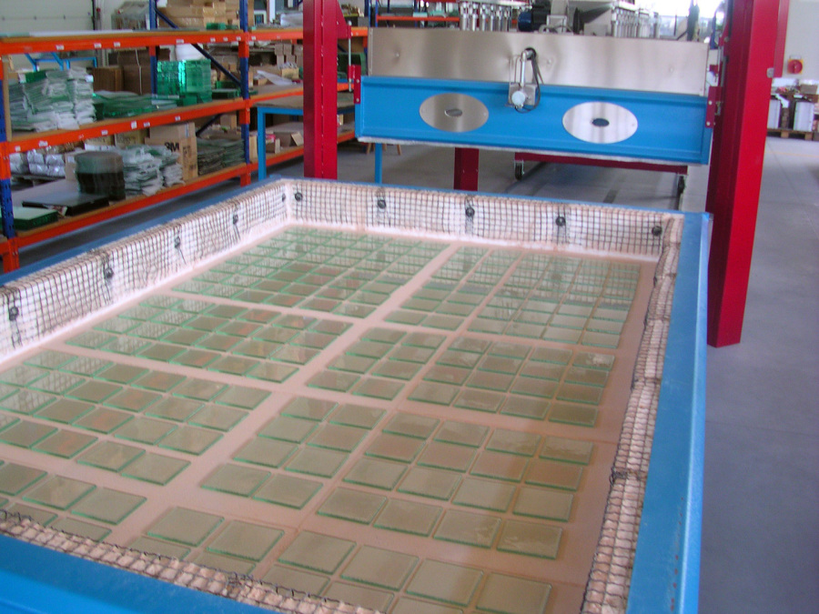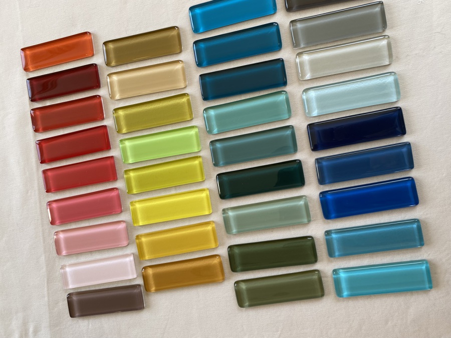 Le verre est d’abord coupé à la main, puis passé dans le four, lavé et séché, puis peint en sous face, offrant ainsi une déclinaison dans une large palette de couleurs – voir rubrique « les coloris ».